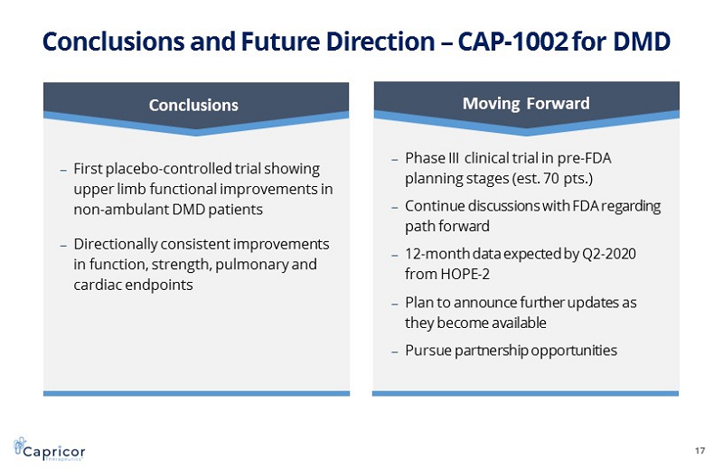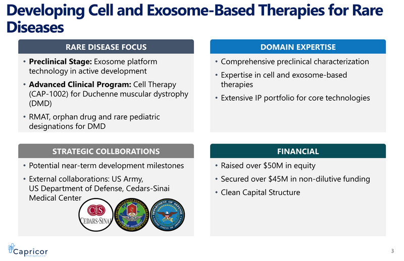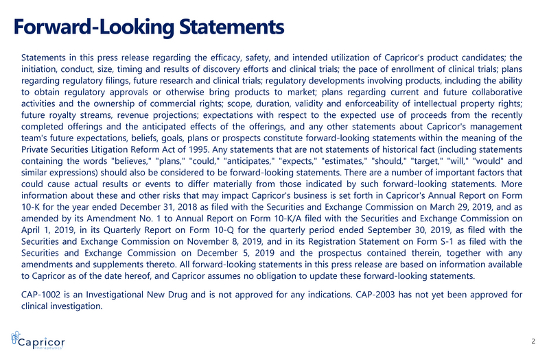 Forward - Looking Statements 2 Statements in this press release regarding the efficacy, safety, and intended utilization of Capricor's product candidates ; the initiation, conduct, size, timing and results of discovery efforts and clinical trials ; the pace of enrollment of clinical trials ; plans regarding regulatory filings, future research and clinical trials ; regulatory developments involving products, including the ability to obtain regulatory approvals or otherwise bring products to market ; plans regarding current and future collaborative activities and the ownership of commercial rights ; scope, duration, validity and enforceability of intellectual property rights ; future royalty streams, revenue projections ; expectations with respect to the expected use of proceeds from the recently completed offerings and the anticipated effects of the offerings, and any other statements about Capricor's management team's future expectations, beliefs, goals, plans or prospects constitute forward - looking statements within the meaning of the Private Securities Litigation Reform Act of 1995 . Any statements that are not statements of historical fact (including statements containing the words "believes," "plans," "could," "anticipates," "expects," "estimates," "should," "target," "will," "would" and similar expressions) should also be considered to be forward - looking statements . There are a number of important factors that could cause actual results or events to differ materially from those indicated by such forward - looking statements . More information about these and other risks that may impact Capricor's business is set forth in Capricor's Annual Report on Form 10 - K for the year ended December 31 , 2018 as filed with the Securities and Exchange Commission on March 29 , 2019 , and as amended by its Amendment No . 1 to Annual Report on Form 10 - K/A filed with the Securities and Exchange Commission on April 1 , 2019 , in its Quarterly Report on Form 10 - Q for the quarterly period ended September 30 , 2019 , as filed with the Securities and Exchange Commission on November 8 , 2019 , and in its Registration Statement on Form S - 1 as filed with the Securities and Exchange Commission on December 5 , 2019 and the prospectus contained therein, together with any amendments and supplements thereto . All forward - looking statements in this press release are based on information available to Capricor as of the date hereof, and Capricor assumes no obligation to update these forward - looking statements . CAP - 1002 is an Investigational New Drug and is not approved for any indications . CAP - 2003 has not yet been approved for clinical investigation .