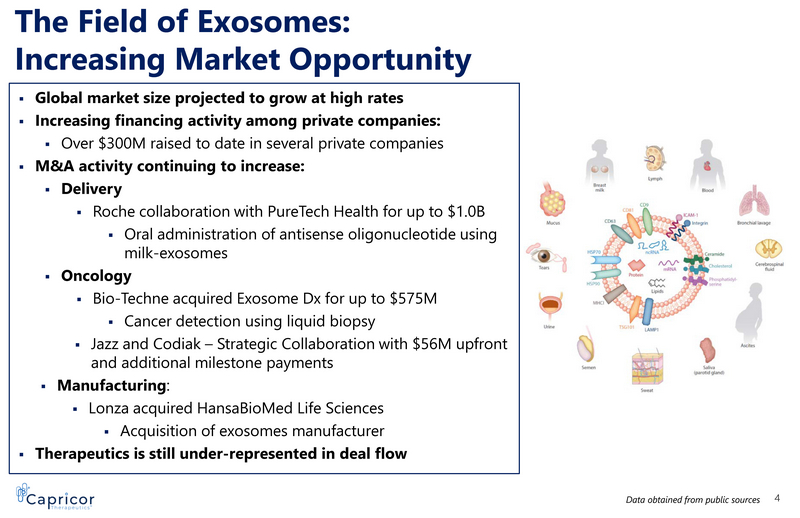 Developing Cell and Exosome - Based Therapies for Rare Diseases RARE DISEASE FOCUS STRATEGIC COLLBORATIONS DOMAIN EXPERTISE FINANCIAL • Preclinical Stage: Exosome platform technology in active development • Advanced Clinical Program: Cell Therapy (CAP - 1002) for Duchenne muscular dystrophy (DMD) • RMAT, orphan drug and rare pediatric designations for DMD • Comprehensive preclinical characterization • Expertise in cell and exosome - based therapies • Extensive IP portfolio for core technologies • Potential near - term development milestones • External collaborations: US Army, US Department of Defense, Cedars - Sinai Medical Center • Raised over $50M in equity • Secured over $45M in non - dilutive funding • Clean Capital Structure 3