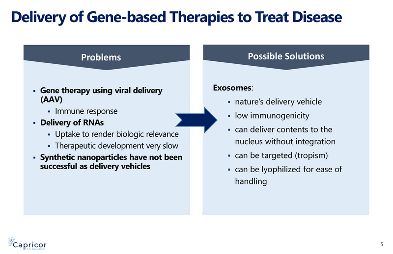 The Field of Exosomes: Increasing Market Opportunity ▪ Global market size projected to grow at high rates ▪ Increasing financing activity among private companies: ▪ Over $300M raised to date in several private companies ▪ M&A activity continuing to increase: ▪ Delivery ▪ Roche collaboration with PureTech Health for up to $1.0B ▪ Oral administration of antisense oligonucleotide using milk - exosomes ▪ Oncology ▪ Bio - Techne acquired Exosome Dx for up to $575M ▪ Cancer detection using liquid biopsy ▪ Jazz and Codiak – Strategic Collaboration with $56M upfront and additional milestone payments ▪ Manufacturing : ▪ Lonza acquired HansaBioMed Life Sciences ▪ Acquisition of exosomes manufacturer ▪ Therapeutics is still under - represented in deal flow 4 Data obtained from public sources