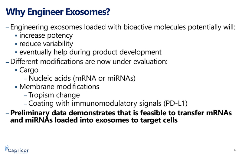 Delivery of Gene - based Therapies to Treat Disease ▪ Gene therapy using viral delivery (AAV) ▪ Immune response ▪ Delivery of RNAs ▪ Uptake to render biologic relevance ▪ Therapeutic development very slow ▪ Synthetic nanoparticles have not been successful as delivery vehicles 5 Exosomes : ▪ nature’s delivery vehicle ▪ low immunogenicity ▪ can deliver contents to the nucleus without integration ▪ can be targeted (tropism) ▪ can be lyophilized for ease of handling Problems Possible Solutions