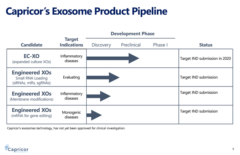 Capricor’s Exosome Product Pipeline 9 Candidate Target Indications Development Phase Status Discovery Preclinical Phase I EC - XO (expanded culture XOs) Inflammatory diseases Target IND submission in 2020 Engineered XOs Small RNA Loading (siRNAs, miRs , sgRNAs) Evaluating Target IND submission Engineered XOs (Membrane modifications) Inflammatory diseases Target IND submission Engineered XOs (mRNA for gene editing) Monogenic diseases Target IND submission Capricor's exosomes technology, has not yet been approved for clinical investigation.