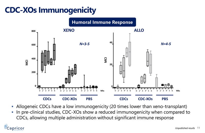 CDC - XOs Immunogenicity ▪ Allogeneic CDCs have a low immunogenicity (20 times lower than xeno - transplant) ▪ In pre - clinical studies, CDC - XOs show a reduced immunogenicity when compared to CDCs, allowing multiple administration without significant immune response Humoral Immune Response CDC_1CDC_2CDC_3CDC_4CDC_5CDC_6-EXO_1EXO_2EXO_3EXO_4EXO_5EXO_6-PBS_1PBS_2PBS_3PBS_4PBS_5PBS__6 0 20 40 Phase 3 IgG M C I N=3 - 5 CDCs CDC - XOs PBS N=4 - 5 0 200 400 600 800 MCI 0 20 40 MCI XENO ALLO CDCs CDC - XOs PBS 0 2 * 3 4 * 5 6 Wks 0 2 * 3 4 * 5 6 0 2 * 3 4 * 5 6 0 2 * 3 4 * 5 6 Wks 0 2 * 3 4 * 5 6 0 2 * 3 4 * 5 6 11 Unpublished results