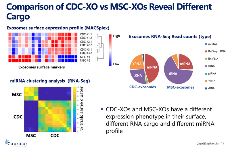 MSC CDC MSC CDC Comparison of CDC - XO vs MSC - XOs Reveal Different Cargo CDC - exosomes MSC - exosomes miRNA clustering analysis (RNA - Seq) Exosomes RNA - Seq Read counts (type) High Low Exosomes surface expression profile ( MACSplex ) CDC #1.1 CDC #1.2 CDC #2.1 CDC #2.2 CDC #3.1 CDC #3.2 MSC #1 MSC #2 ▪ CDC - XOs and MSC - XOs have a different expression phenotype in their surface, different RNA cargo and different miRNA profile Exosomes surface markers 12 Unpublished results