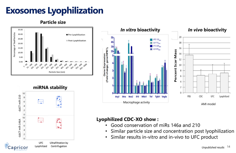 Exosomes Lyophilization Particle size miRNA stability Lyophilized CDC - XO show : • Good conservation of miRs 146a and 210 • Similar particle size and concentration post lyophilization • Similar results in - vitro and in - vivo to UFC product In vitro bioactivity In vivo bioactivity Macrophage activity AMI model 14 Unpublished results
