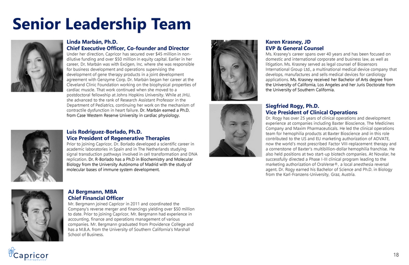 Senior Leadership Team Linda Marbán , Ph.D. Chief Executive Officer, Co - founder and Director Under her direction, Capricor has secured over $45 million in non - dilutive funding and over $50 million in equity capital. Earlier in her career, Dr. Marbán was with Excigen, Inc. where she was responsible for business development and operations supervising the development of gene therapy products in a joint development agreement with Genzyme Corp. Dr. Marbán began her career at the Cleveland Clinic Foundation working on the biophysical properties of cardiac muscle. That work continued when she moved to a postdoctoral fellowship at Johns Hopkins University. While at JHU, she advanced to the rank of Research Assistant Professor in the Department of Pediatrics, continuing her work on the mechanism of contractile dysfunction in heart failure. Dr. Marbán earned a Ph.D. from Case Western Reserve University in cardiac physiology. Karen Krasney , JD EVP & General Counsel Ms. Krasney’s career spans over 40 years and has been focused on domestic and international corporate and business law, as well as litigation. Ms. Krasney served as legal counsel of Biosensors International Group Ltd., a multinational medical device company that develops, manufactures and sells medical devices for cardiology applications. Ms. Krasney received her Bachelor of Arts degree from the University of California, Los Angeles and her Juris Doctorate from the University of Southern California. Luis Rodriguez - Borlado , Ph.D. Vice President of Regenerative Therapies Prior to joining Capricor, Dr. Borlado developed a scientific career in academic laboratories in Spain and in The Netherlands studying signal transduction pathways involved in cell transformation and DNA replication. Dr. R - Borlado has a Ph.D in Biochemistry and Molecular Biology from the University Autónoma of Madrid with the study of molecular bases of immune system development. AJ Bergmann, MBA Chief Financial Officer Mr. Bergmann joined Capricor in 2011 and coordinated the Company’s reverse merger and financings yielding over $50 million to date. Prior to joining Capricor, Mr. Bergmann had experience in accounting, finance and operations management of various companies. Mr. Bergmann graduated from Providence College and has a M.B.A. from the University of Southern California’s Marshall School of Business. Siegfried Rogy , Ph.D. Vice President of Clinical Operations Dr. Rogy has over 25 years of clinical operations and development experience at companies including Baxter Bioscience, The Medicines Company and Maxim Pharmaceuticals. He led the clinical operations team for hemophilia products at Baxter Bioscience and in this role contributed to the US and EU marketing authorization of ADVATE, now the world’s most prescribed Factor VIII - replacement therapy and a cornerstone of Baxter’s multibillion - dollar hemophilia franchise. He also held positions at two start - up biotech companies. At Novalar , he successfully directed a Phase I - III clinical program leading to the marketing authorization of OraVerse ®, a local anesthesia reversal agent. Dr. Rogy earned his Bachelor of Science and Ph.D. in Biology from the Karl - Franzens - University, Graz, Austria. 18
