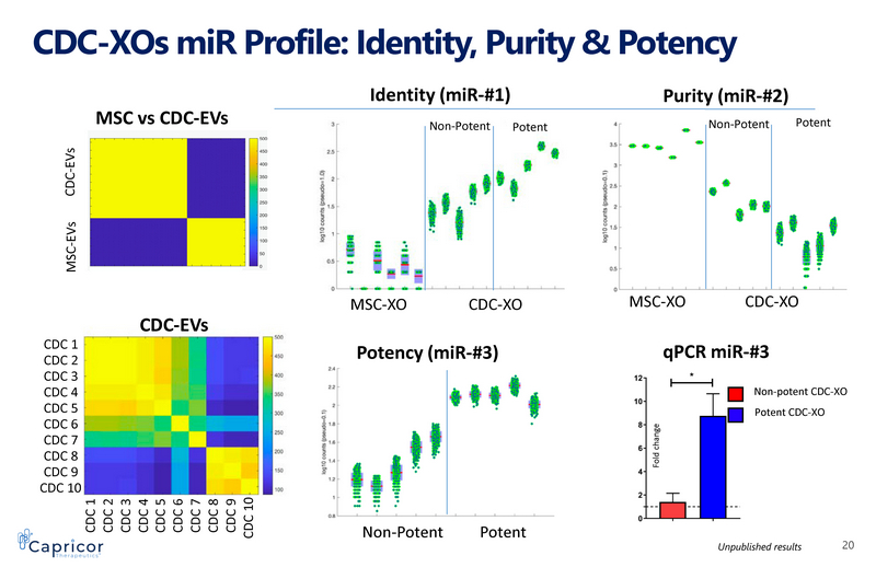 CDC - XOs miR Profile: Identity, Purity & Potency Potent Non - Potent Potency ( miR - #3) CDC 1 CDC 2 CDC 3 CDC 4 CDC 5 CDC 6 CDC 7 CDC 8 CDC 10 CDC 9 CDC 1 CDC 2 CDC 3 CDC 4 CDC 5 CDC 6 CDC 7 CDC 8 CDC 9 CDC 10 MSC vs CDC - EVs CDC - EVs CDC - EVs MSC - EVs Potent Non - Potent MSC - XO CDC - XO Purity ( miR - #2) Non - potent CDC - XO Potent CDC - XO qPCR miR - #3 Fold change Potent Non - Potent MSC - XO CDC - XO Identity ( miR - #1) Unpublished results 20