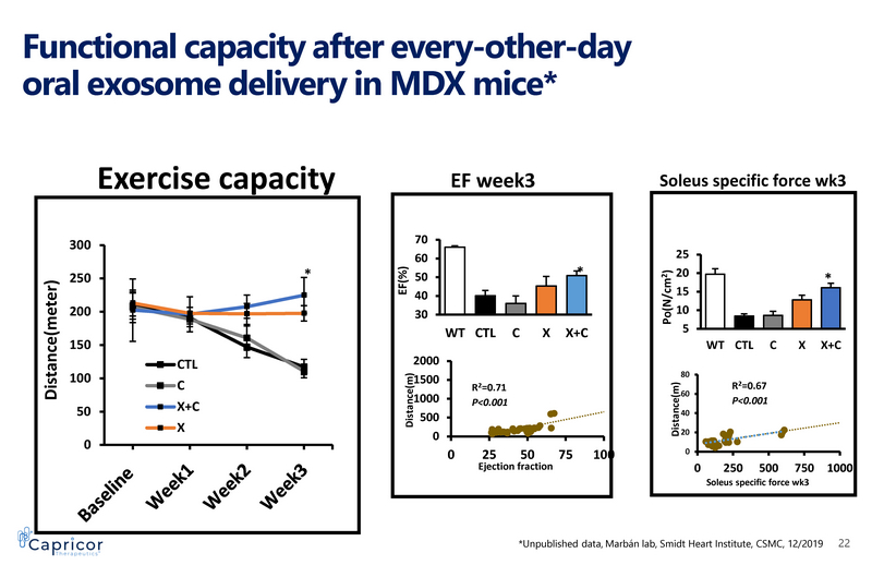0 50 100 150 200 250 300 Exercise capacity CTL C X+C X * Distance(meter) Distance(m) Ejection fraction 0 500 1000 1500 2000 0 25 50 75 100 30 40 50 60 70 WT CTL C X X+C EF(%) * R 2 =0.71 P<0.001 EF week3 5 10 15 20 25 WT CTL C X X+C Soleus specific force wk3 Po(N/cm 2 ) * 0 20 40 60 80 0 250 500 750 1000 R 2 =0.67 P<0.001 Distance(m) Functional capacity after every - other - day oral exosome delivery in MDX mice* Soleus specific force wk3 *Unpublished data, Marbán lab, Smidt Heart Institute, CSMC, 12/2019 22