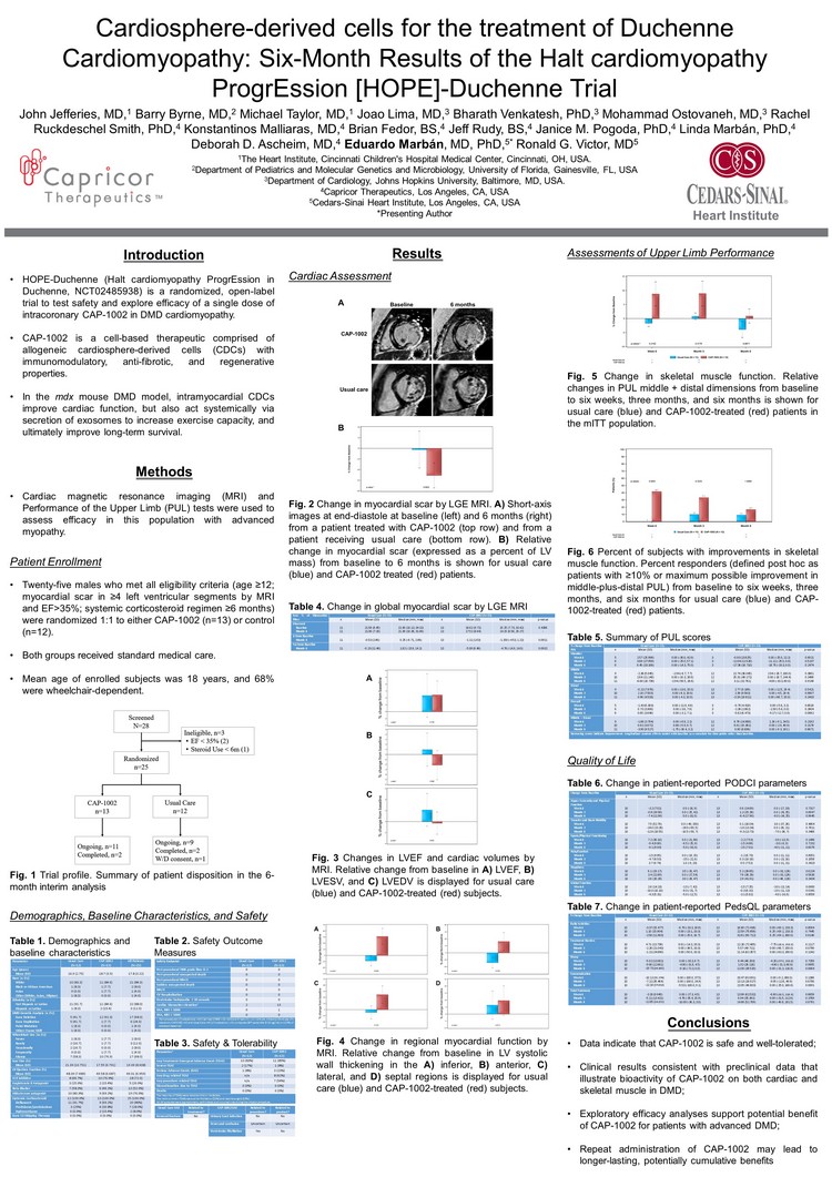 Cardiosphere - derived cells for the treatment of Duchenne Cardiomyopathy: Six - Month Results of the Halt cardiomyopathy ProgrEssion [HOPE] - Duchenne Trial John Jefferies, MD, 1 Barry Byrne, MD, 2 Michael Taylor, MD, 1 Joao Lima, MD, 3 Bharath Venkatesh , PhD, 3 Mohammad Ostovaneh , MD, 3 Rachel Ruckdeschel Smith, PhD, 4 Konstantinos Malliaras , MD, 4 Brian Fedor , BS, 4 Jeff Rudy, BS, 4 Janice M. Pogoda , PhD, 4 Linda Marbán , PhD, 4 Deborah D. Ascheim , MD, 4 Eduardo Marbán , MD, PhD, 5* Ronald G. Victor, MD 5 1 The Heart Institute, Cincinnati Children's Hospital Medical Center, Cincinnati, OH, USA. 2 Department of Pediatrics and Molecular Genetics and Microbiology, University of Florida, Gainesville, FL, USA 3 Department of Cardiology, Johns Hopkins University, Baltimore, MD, USA. 4 Capricor Therapeutics, Los Angeles, CA, USA 5 Cedars - Sinai Heart Institute, Los Angeles, CA, USA *Presenting Author Introduction Parameter Usual Care (N=12) CAP - 1002 (N=13) All Patients (N=25) Age (years) Mean (SD) 16.9 (2.75) 18.7 (3.5) 17.8 (3.22) Race [n ( % )] White Black or African American Asian Other (White, Asian, Filipino) 10 (83.3) 1 (8.3) 0 (0.0) 1 (8.3) 11 (84.6) 1 (7.7) 1 (7.7) 0 (0.0) 21 (84.0) 2 (8.0) 1 (4.0) 1 (4.0) Ethnicity [n ( % )] Not Hispanic or Latino Hispanic or Latino 11 (91.7) 1 (8.3) 11 (84.6) 2 (15.4) 22 (88.0) 3 (12.0) DMD Genetic Analysis [n ( % )] Exon Deletion Exon Duplication Point Mutation Other : Frame Shift 5 (41.7) 5 (41.7) 1 (8.3) 1 (8.3) 12 (92.3) 1 (7.7) 0 (0.0) 0 (0.0) 17 (68.0) 6 (24.0) 1 (4.0) 1 (4.0) Wheelchair Use [(n ( % )] Never Rarely Occasionally Frequently Always 1 (8.3) 2 (16.7) 2 (16.7) 0 (0.0) 7 (58.3) 1 (7.7) 1 (7.7) 0 (0.0) 1 (7.7) 10 (76.9) 2 (8.0) 3 (12.0) 2 (8.0) 1 (4.0) 17 (68.0) Scar Size ( % ) Mean (SD) 21.39 (10.751) 17.55 (6.791) 19.39 (8.938) LV Ejection Fraction ( % ) Mean (SD) 48.39 (7.489) 49.58 (6.687) 49.01 (6.959) ACE Inhibitor 8 (66.7%) 10 (76.9%) 18 (72.0) Angiotensin II Antagonist 3 (25.0%) 2 (15.4%) 5 (20.0%) Beta Blocker 7 (58.3%) 6 (46.2%) 13 (52.0%) Aldosterone antagonist 10 (83.3%) 9 (69.2%) 19 (76.0%) Systemic Corticosteroid Deflazacort Prednisone/prednisolone Hydrocortisone 12 (100.0%) 11 (91.7%) 3 (25%) 0 (0.0%) 13 (100.0%) 9 (69.2%) 4 (30.8%) 2 (15.4%) 25 (100.0%) 20 (80%) 7 (28.0%) 2 (8.0%) Exon 51 - Skipping Therapy 0 (0.0%) 0 (0.0%) 0 (0.0%) Safety Endpoint Usual Care (N=12) CAP - 1002 (N=13) Peri - procedural TIMI grade flow 0 - 2 0 0 Peri - procedural unexpected death 0 0 Peri - procedural MACE 0 0 Sudden unexpected death 0 0 MACE 0 0 CV Hospitalization 0 0 Ventricular Tachycardia ≥ 30 seconds 0 0 Cardiac biomarker elevation 1 2 13 DSA, MFI ≥ 1000 0 1 DSA, MFI ≥ 5000 0 0 1 Peri - procedural cTn elevations : n= 13 (all had CKMB > 5 x ULN and 8 had cTn > 2 x ULN pre infusion) ; On - study cTn elevation : CAP - 1002 n= 2 and Usual Care n= 2 [ cTn elevation : > 5 x composite 99 th percentile ( 0 . 03 pg /mL) or ≥ 20 % of elevated baseline] Scar % of Myocardial Mass Usual Care (N=11) CAP - 1002 (N=13) n Mean (SD) Median (min, max) n Mean (SD) Median (min, max) p - value Observed Baseline Month 6 11 11 21.58 (8.45) 21.06 (7.20) 22.30 (10.13, 34.32) 21.39 (10.38, 31.08) 13 13 18.62 (9.72) 17.52 (8.84) 15.25 (7.73, 33.42) 14.15 (6.58, 29.27) 0.4386 - ∆ from Baseline Month 6 11 - 0.53 (2.86) 0.25 ( - 6.71, 2.88) 13 - 1.11 (1.63) - 1.150 ( - 4.53, 1.22) 0.0911 % ∆ from Baseline Month 6 11 - 0.23 (11.48) 1.82 ( - 23.9, 14.2) 13 - 5.09 (8.48) - 4.78 ( - 14.9, 14.0) 0.0932 Parameter 1 Usual Care (N=12) CAP - 1002 (N=13) Any Treatment - Emergent Adverse Event (TEAE) 10 (83%) 11 (85%) Severe TEAE 2 (17%) 1 (8%) Serious Adverse Events (SAE) 1 (8%) 3 (23%) Any drug - related TEAE n/a 8 (62%) Any procedure - related TEAE n/a 7 (54%) Discontinuation due to TEAE 0 (0%) 0 (0%) Deaths 0 (0%) 0 (0%) The majority of TEAEs were rated as mild or moderate. The most common TEAEs were atrial fibrillation (20%) and nasoharyngitis (16%). All AF episodes were asymptomatic, self - limited, and occurred only during the infusion procedure. % change from Baseline PUL Usual Care (N=11) CAP - 1002 (N=13) n Mean (SD) Median (min, max) n Mean (SD) Median (min, max) p - value Shoulder Week 6 Month 3 Month 6 5 6 6 2.57 (25.998) 3.69 (27.959) 8.45 (33.168) 0.00 ( - 30.0, 42.9) 0.00 ( - 25.0, 57.1) 0.00 ( - 14.3, 75.0) 3 3 3 - 0.93 (23.625) - 12.04 (12.526) - 17.36 (16.710) 0.00 ( - 25.0, 22.2) - 11.11 ( - 25.0, 0.0) - 18.75 ( - 33.3, 0.0) 0.9021 0.5237 0.2474 Middle Week 6 Month 3 Month 6 9 10 11 - 2.36 (5.045) 2.64 (11.140) - 6.60 (20.739) - 2.94 ( - 8.7, 7.7) 0.00 ( - 10.3, 28.6) - 2.94 ( - 56.5, 28.6) 12 12 12 22.74 (36.045) 25.31 (48.172) 3.11 (32.761) 2.94 ( - 26.7, 100.0) 0.00 ( - 26.7, 144.4) - 4.69 ( - 33.3, 80.0) 0.3861 0.3496 0.9149 Distal Week 6 Month 3 Month 6 9 10 11 - 0.22 (7.878) 2.10 (7.503) 0.96 (4.533) 0.00 ( - 13.0, 15.0) 0.00 ( - 8.3, 20.0) 0.00 ( - 4.3, 10.0) 13 13 13 2.77 (9.188) 2.39 (9.563) - 3.19 (19.811) 0.00 ( - 12.5, 29.4) 0.00 ( - 4.5, 29.4) 0.00 ( - 66.7, 15.0) 0.5421 0.9807 0.3433 Overall Week 6 Month 3 Month 6 5 6 6 - 1.43 (6.303) 0.73 (3.908) 0.65 (3.648) 0.00 ( - 11.9, 4.8) 0.00 ( - 3.6, 7.9) 0.00 ( - 3.2, 7.1) 3 3 3 - 0.79 (4.419) - 2.38 (2.862) - 5.62 (6.473) 0.00 ( - 5.6, 3.2) - 1.59 ( - 5.6, 0.0) - 4.17 ( - 12.7, 0.0) 0.8618 0.3904 0.0882 Middle + Distal Week 6 Month 3 Month 6 9 10 11 - 1.66 (3.704) 0.82 (3.672) - 3.90 (9.527) 0.00 ( - 8.8, 2.2) 0.88 ( - 5.9, 6.7) - 1.75 ( - 30.4, 3.2) 12 12 12 8.78 (14.968) 8.91 (15.361) 0.90 (8.698) 1.28 ( - 9.1, 34.5) 0.00 ( - 2.9, 40.9) 0.00 ( - 9.3, 182.) 0.2192 0.3178 0.8671 Increasing scores indicate improvement . Longitudinal random effects model with baseline as a covariate for time points other than baseline . Change from Baseline Usual Care (N=11) CAP - 1002 (N=13) n Mean (SD) Median (min, max) n Mean (SD) Median (min, max) p - value Upper Extremity and Physical Function Week 6 Month 3 Month 6 10 10 10 - 3.2 (7.02) - 0.8 (19.56) - 7.4 (11.99) 0.0 ( - 16, 9) 0.0 